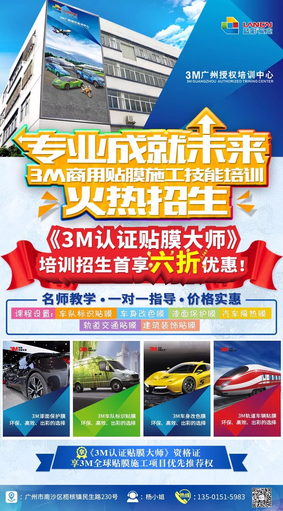 3M商用贴膜广州授权培训中心坐落于广州市南沙区榄核镇民生路230号——广州市蓝彩实业有限公司,是3M华南区“广州唯一指定3M商用贴膜授权培训中心”。